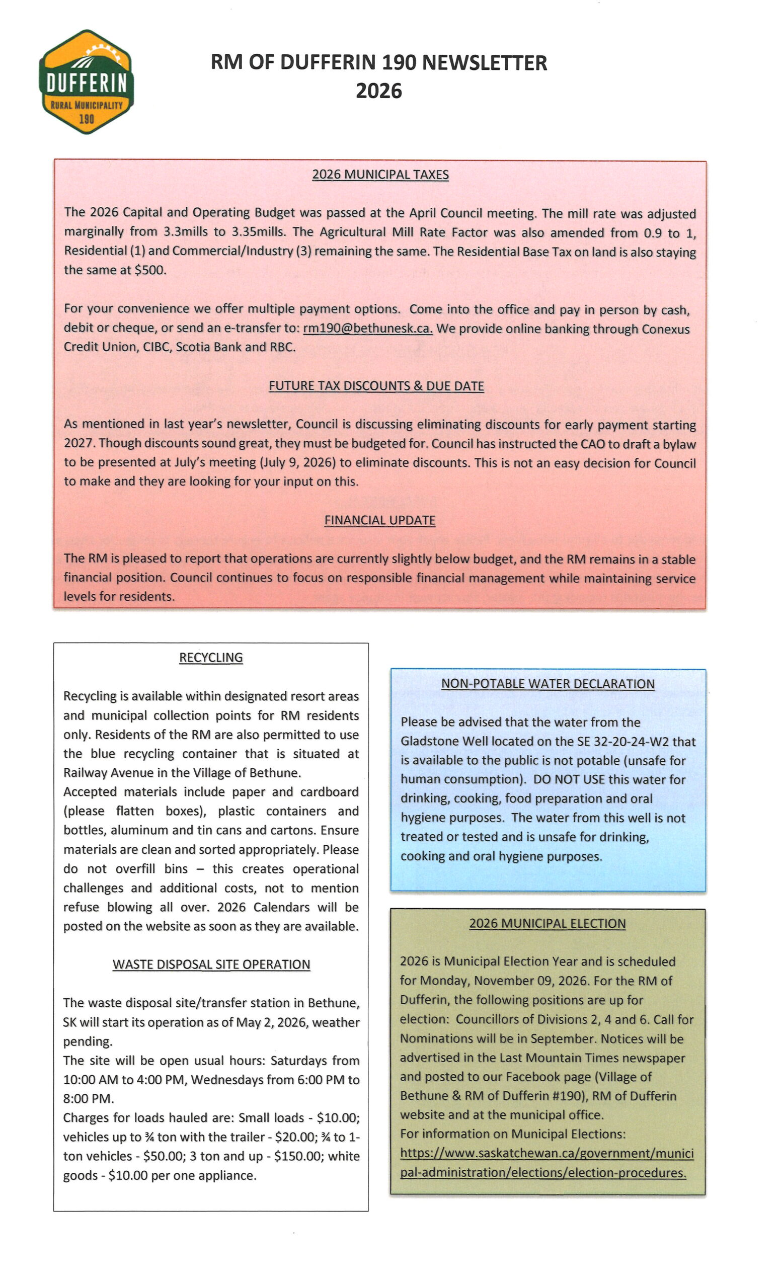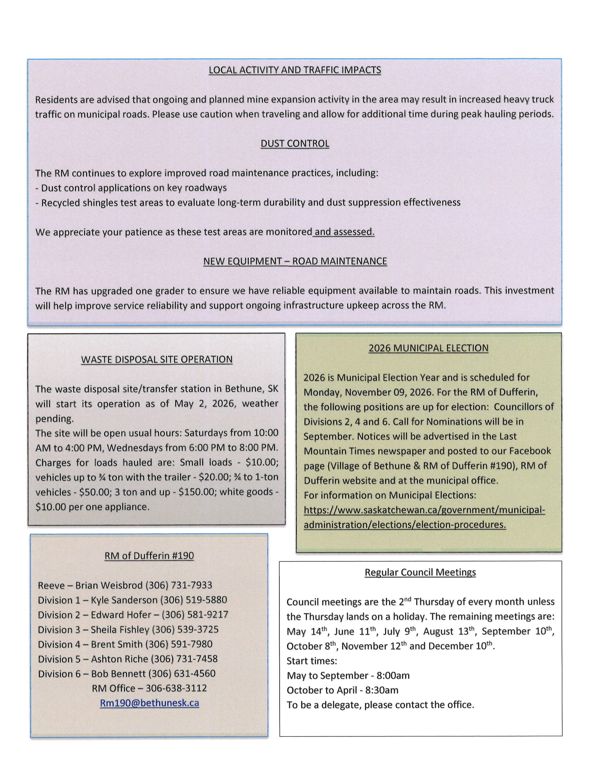 Due to the weather and current road conditions, Loraas Disposal had to reschedule recycling collection service. The new date is April 18th 2026, Saturday. If any questions or concerns, please contact the office (306) 638 3112. Thank you.